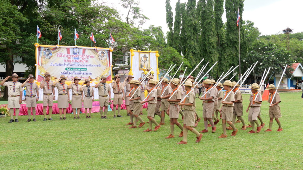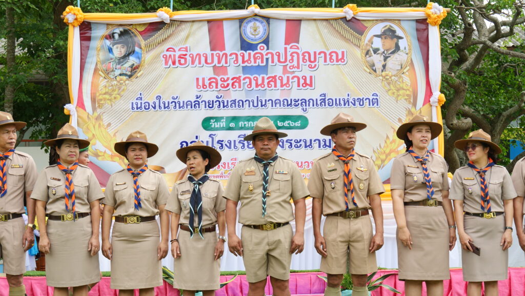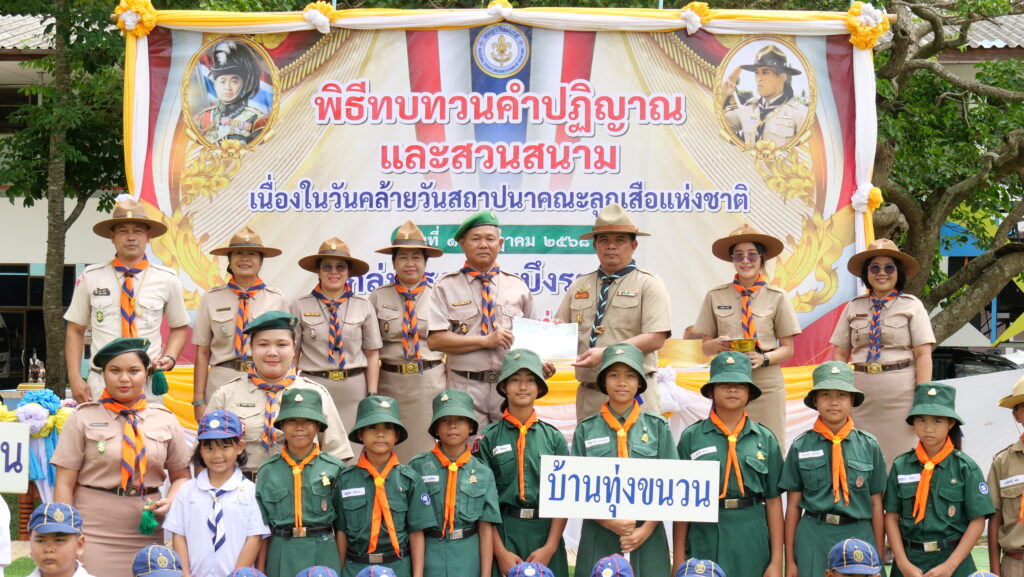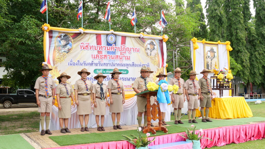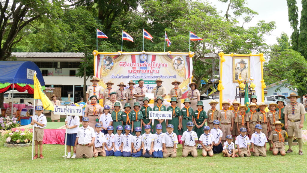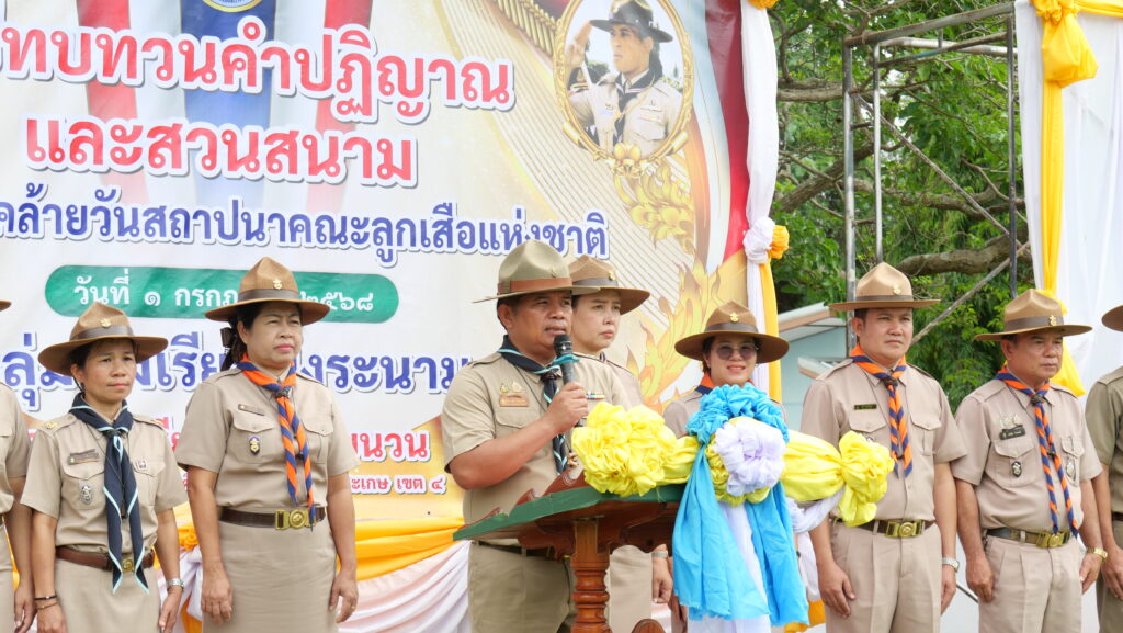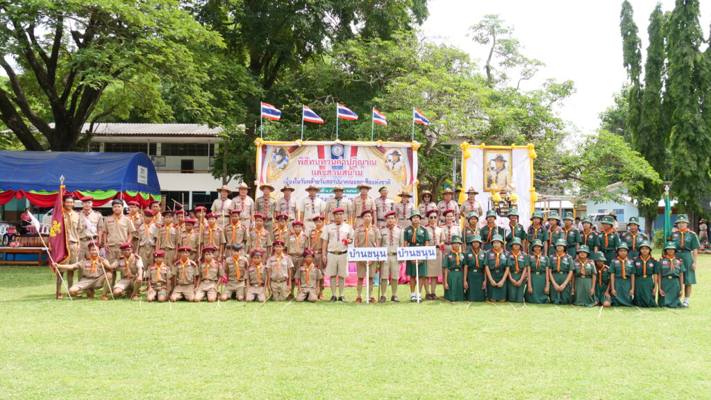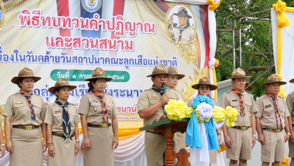 วันที่ 2 กรกฎาคม 2568 นายลิขิต เพ็งประสิทธิพงศ์ ผู้อำนวยการสำนักงานเขตพื้นที่การศึกษาประถมศึกษาศรีสะเกษ เขต 4 เป็นประธานในพิธีทบทวนคำปฏิญาณและสวนสนามลูกเสือ เนื่องในวันคล้ายวันสถาปนาคณะลูกเสือแห่งชาติ 1 กรกฎาคม ประจำปี 2568 กลุ่มโรงเรียนบึงระนาม พร้อมตรวจเยี่ยมให้กำลังใจผู้อำนวยการลูกเสือ ผู้บังคับบัญชาลูกเสือ และกองลูกเสือ – เนตรนารี จาก 19 โรงเรียน โดยมี นายสมศักดิ์ วงค์บุดดี ผู้อำนวยการโรงเรียนบ้านสวนกล้วย ประธานกลุ่มโรงเรียนบึงระนาม กล่าวรายงาน พร้อมด้วยผู้อำนวยการลูกเสือ ผู้บังคับบัญชาลูกเสือจำนวน 88 คน และลูกเสือ – เนตรนารี จำนวน 761 คน ที่มาร่วมพิธี ณ สนามโรงเรียนบ้านทุ่งขนวน อำเภอกันทรลักษ์ จังหวัดศรีสะเกษ การดำเนินการจัดพิธีเป็นไปด้วยความเรียบร้อย