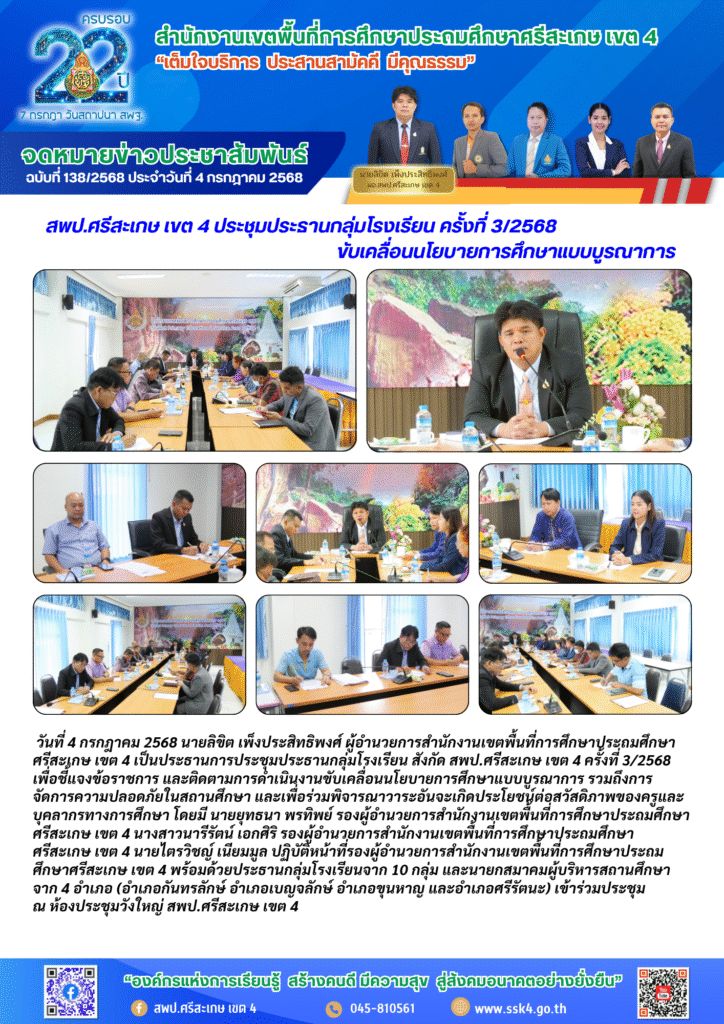 สพป.ศรีสะเกษ เขต 4 ประชุมประธานกลุ่มโรงเรียน ครั้งที่ 3/2568 ขับเคลื่อนนโยบายการศึกษาแบบบูรณาการBy นายกัลญศักดิ์ รัตนาฆพิมพ์ / 10 กรกฎาคม 2025