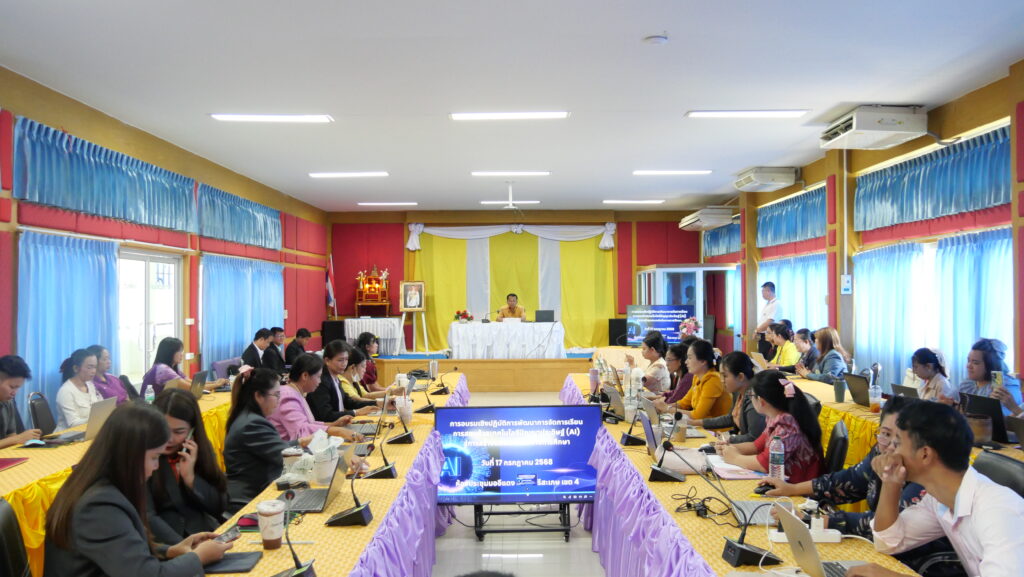 วันที่ 17 กรกฎาคม 2568 นายลิขิต เพ็งประสิทธิพงศ์ ผู้อำนวยการสำนักงานเขตพื้นที่การศึกษาประถมศึกษาศรีสะเกษ เขต 4 มอบหมายให้ นายปรีชา จันทวี รองผู้อำนวยการสำนักงานเขตพื้นที่การศึกษาประถมศึกษาศรีสะเกษ เขต 4 เป็นประธานเปิดการอบรมเชิงปฏิบัติการพัฒนาการจัดการเรียนการสอนด้วยเทคโนโลยีปัญญาประดิษฐ์ (AI) สู่การสร้างแพลตฟอร์มทางการศึกษา ประจำปีงบประมาณ พ.ศ. 2568 ณ ห้องประชุมมออีแดง สพป.ศรีสะเกษ เขต 4 โดยมี นายสาน แก้วกัณหา ผู้อำนวยการกลุ่มนิเทศ ติดตามและประเมินผลการจัดการศึกษา กล่าวรายงาน พร้อมด้วยคณะศึกษานิเทศก์ ครูและบุคลากรทางการศึกษาที่สมัครใจเข้าร่วมอบรมจำนวน 40 คน คณะวิทยากรได้รับเกียรติจาก นายอรรถพล สุรวิทย์ รองผู้อำนวยการโรงเรียนบ้านหนองงูเหลือม (คุรุราษฎร์รัฐกิจโกศล) และ นายคุณากร ธนที ครูโรงเรียนบ้านจันทน์หอมตาเสก การจัดอบรมในครั้งนี้มีวัตถุประสงค์เพื่อพัฒนาครูและบุคลากรทางการศึกษาให้มีความรู้ความเข้าใจ สามารถออกแบบและจัดการเรียนการสอนด้วยเทคโนโลยีปัญญาประดิษฐ์ (AI) โดยใช้ ChatGPT, Gemini, Copilot, Google site, Canva AI เพื่อให้สามารถสร้างแพลตฟอร์มทางการศึกษาให้นักเรียนได้เรียนรู้ได้ทุกที่ทุกเวลา เช่น การสร้างเนื้อหาการเรียนการสอนและแบบฝึกหัดออนไลน์ และแพลตฟอร์มที่ช่วยเพิ่มประสิทธิภาพการบริหารงานด้านสารสนเทศเพื่อการบริหารการจัดการสำหรับครู เช่น ระบบการเยี่ยมบ้านนักเรียน ทั้งนี้ เพื่อเป็นการลดการใช้เอกสาร ช่วยลดภาระครูและบุคลากรทางการศึกษา ตามนโยบายและจุดเน้นของ สพฐ.