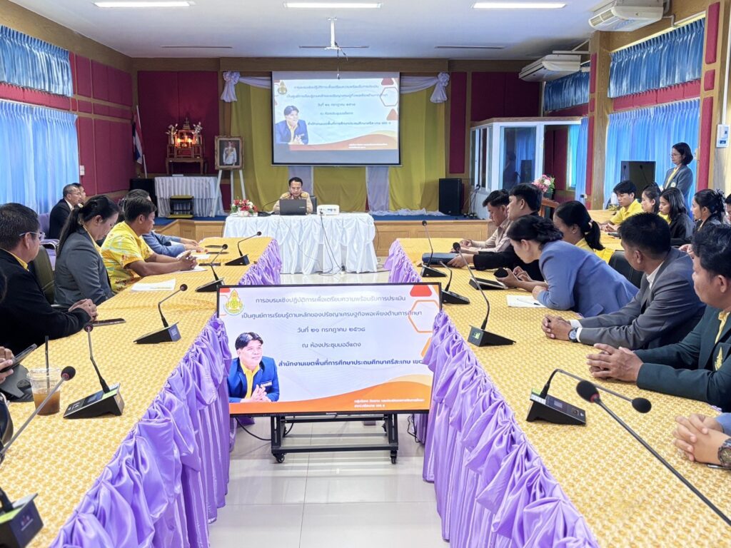 วันที่ 21 กรกฎาคม 2568 นายลิขิต เพ็งประสิทธิพงศ์ ผู้อำนวยการสำนักงานเขตพื้นที่การศึกษาประถมศึกษาศรีสะเกษ เขต 4 มอบหมายให้ นายปรีชา จันทวี รองผู้อำนวยการสำนักงานเขตพื้นที่การศึกษาประถมศึกษาศรีสะเกษ เขต 4 เป็นประธานในพิธีเปิดและบรรยายพิเศษ “การประชุมเชิงปฏิบัติการเตรียมความพร้อมรับการประเมินสถานศึกษาพอเพียงเป็นศูนย์การเรียนรู้ตามหลักปรัชญาของเศรษฐกิจพอเพียงด้านการศึกษา (ศรร.)” โดยมีผู้เข้าประชุมเป็นผู้บริหารและครู จำนวน 43 คน จาก 7 โรงเรียนในสังกัด ได้แก่ โรงเรียนบ้านตระกาศขอนแก่น โรงเรียนบ้านสังเม็ก โรงเรียนบ้านจันทน์หอมตาเสก โรงเรียนบ้านโคก (อสพป.32) โรงเรียนบ้านขนุน โรงเรียนบ้านขุนหาญ และโรงเรียนบ้านหนองจิก มีวัตถุประสงค์เพื่อเพื่อแลกเปลี่ยนเรียนรู้ และเตรียมรับการประเมินด้วยการลงพื้นที่จริงจากคณะกรรมการประเมินฯ ต่อไป