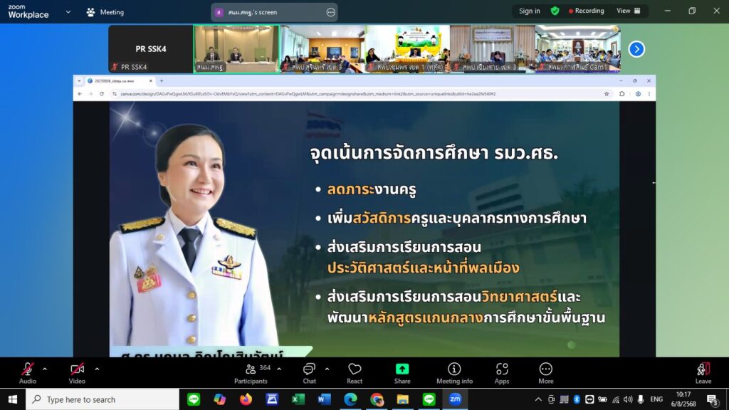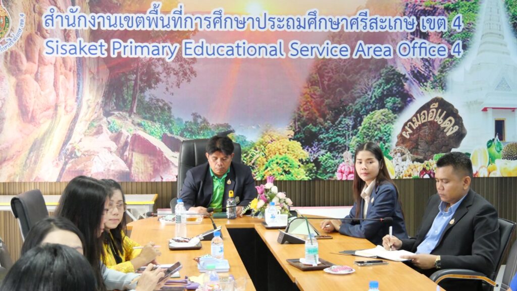 วันที่ 6 สิงหาคม 2568 เวลา 09.00 น. นายลิขิต เพ็งประสิทธิพงศ์ ผู้อำนวยการสำนักงานเขตพื้นที่การศึกษาประถมศึกษาศรีสะเกษ เขต 4 พร้อมด้วย นางสาวนารีรัตน์ เอกศิริ รองผู้อำนวยการสำนักงานเขตพื้นที่การศึกษาประถมศึกษาศรีสะเกษ เขต 4 และผู้อำนวยการกลุ่ม เข้าร่วมประชุมผู้อำนวยการสำนักงานเขตพื้นที่การศึกษา ทั่วประเทศ ครั้งที่ 6/2568 ผ่านระบบ Zoom Meeting ณ ห้องประชุมวังใหญ่ สพป.ศรีสะเกษ เขต 4 โดยมี ว่าที่ร้อยตรี ธนุ วงษ์จินดา เลขาธิการคณะกรรมการการศึกษาขั้นพื้นฐาน เป็นประธานการประชุม เพื่อแจ้งข้อราชการสำคัญและนโยบายสำนักงานคณะกรรมการการศึกษาขั้นพื้นฐาน (สพฐ.) ที่สอดคล้องกับนโยบายรัฐบาลและกระทรวงศึกษาธิการ ประจำปีงบประมาณ พ.ศ. 2568 และมีผู้บริหารของ สพฐ. ได้แก่ นางเกศทิพย์ ศุภวานิช รองเลขาธิการ กพฐ. นายพัฒนะ พัฒนทวีดล รองเลขาธิการ กพฐ. นายธีร์ ภวังคนันท์ รองเลขาธิการ กพฐ. นายภูธร จันทะหงษ์ ปุณยจรัสธำรง ผู้ช่วยเลขาธิการ กพฐ. นางภัทริยาวรรณ พันธุ์น้อย ผู้ช่วยเลขาธิการ กพฐ. รวมถึงผู้อำนวยการและรองผู้อำนวยการสำนักงานเขตพื้นที่การศึกษา ทั้ง 245 เขตทั่วประเทศ ผู้บริหารสถานศึกษาสังกัดสำนักบริหารงานการศึกษาพิเศษ 77 จังหวัด เข้าร่วมประชุมดังกล่าว