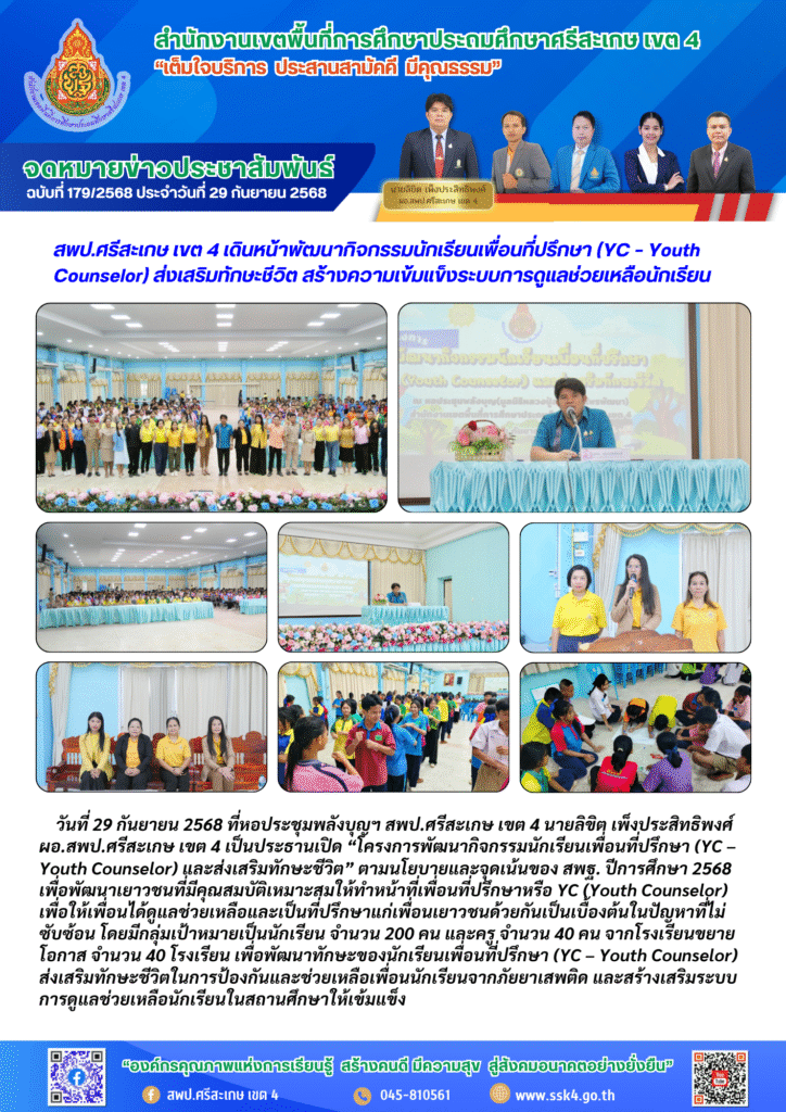 สพป.ศรีสะเกษ เขต 4 เดินหน้าพัฒนากิจกรรมนักเรียนเพื่อนที่ปรึกษา (YC – Youth Counselor) ส่งเสริมทักษะชีวิต สร้างความเข้มแข็งระบบการดูแลช่วยเหลือนักเรียนBy นายกัลญศักดิ์ รัตนาฆพิมพ์ / 9 ตุลาคม 2025