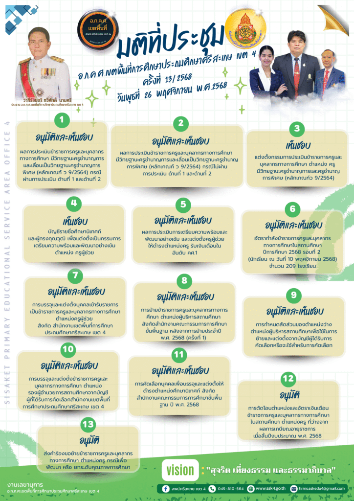 วันที่ 26 พฤศจิกายน 2568 ที่ห้องประชุมมออีแดง สำนักงานเขตพื้นที่การศึกษาประถมศึกษาศรีสะเกษ เขต 4 ว่าที่ร้อยตรี ทวีศักดิ์ นามศรี ประธาน อ.ก.ค.ศ.เขตพื้นที่การศึกษาประถมศึกษาศรีสะเกษ เขต 4 พร้อมด้วย คณะอนุกรรมการ อ.ก.ค.ศ.เขตพื้นที่การศึกษาประถมศึกษาศรีสะเกษ เขต 4 เข้าร่วมประชุมคณะอนุกรรมการ อ.ก.ค.ศ.เขตพื้นที่การศึกษาประถมศึกษาศรีสะเกษ เขต 4 ครั้งที่ 13/2568 โดย นายลิขิต เพ็งประสิทธิพงศ์ ผอ.สพป.ศรีสะเกษ เขต 4 มอบหมายให้ นางสาวนารีรัตน์ เอกศิริ รอง ผอ.สพป.ศรีสะเกษ เขต 4 เข้าร่วมประชุมในครั้งนี้ เพื่อพิจารณาอนุมัติและเห็นชอบด้านการบริหารงานบุคคลด้านต่างๆ ได่แก่