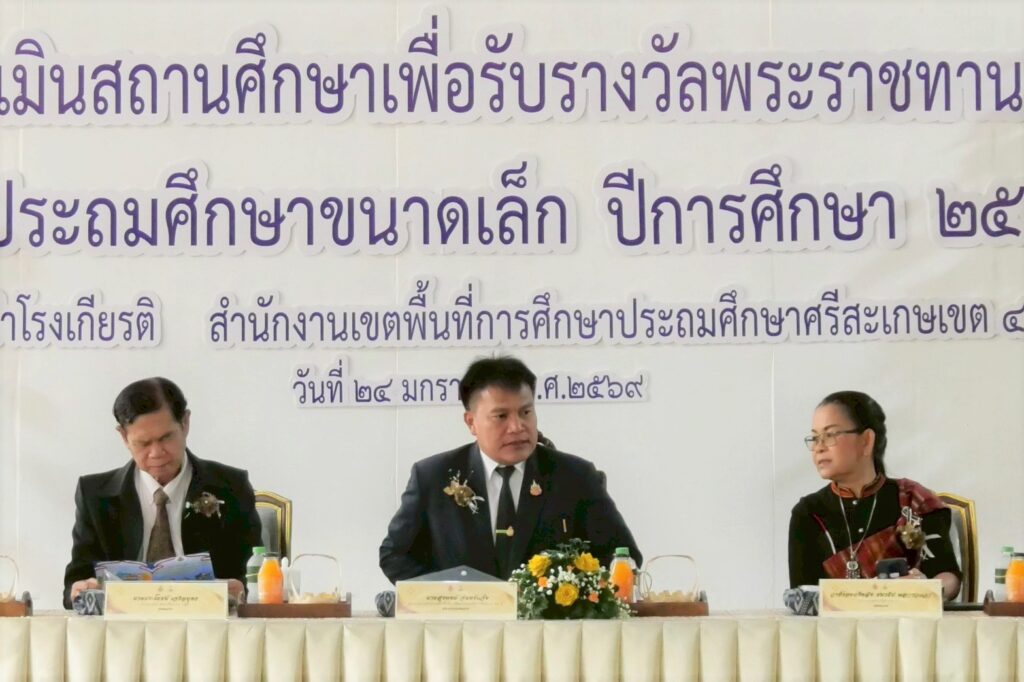 วันที่ 24 มกราคม 2569 นายศักดิ์ ภักเกลี้ยง ผู้อำนวยการสำนักงานเขตพื้นที่การศึกษาประถมศึกษาศรีสะเกษ เขต 4 ร่วมเป็นเกียรติและกล่าวต้อนรับคณะกรรมการประเมินสถานศึกษาเพื่อรับรางวัลพระราชทาน ระดับก่อนประถมศึกษาขนาดเล็ก ประจำปี 2568 นำโดย นายสุรพงษ์ จันทร์แจ้ง ผู้อำนวยการสำนักงานเขตพื้นที่การศึกษาประถมศึกษาศรีสะเกษ เขต 2 ประธานคณะกรรมการประเมินฯ ณ โรงเรียนบ้านสำโรงเกียรติ อำเภอขุนหาญ จังหวัดศรีสะเกษ โดยมี นายศดิศ ณิชกุล นายอำเภอขุนหาญ และนายมงคล สุทธิสน ผู้อำนวยการโรงเรียนบ้านสำโรงเกียรติ ร่วมกล่าวต้อนรับ พร้อมด้วยแขกผู้มีเกียรติร่วมให้การต้อนรับในครั้งนี้ด้วย