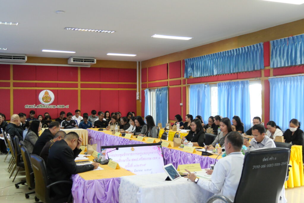 วันที่ 17 มีนาคม 2569 นายศักดิ์ ภักเกลี้ยง ผู้อำนวยการสำนักงานเขตพื้นที่การศึกษาประถมศึกษาศรีสะเกษ เขต 4 เป็นประธานการประชุมบุคลากรในสำนักงานเขตพื้นที่การศึกษาประถมศึกษาศรีสะเกษ เขต 4 ครั้งที่ 3/2569 เพื่อสร้างการรับรู้ และขับเคลื่อนนโยบายสู่การปฏิบัติ โดยมี นายปรีชา จันทวี นางสาวนารีรัตน์ เอกศิริ และนายไตรวิชญ์ เนียมมูล รองผู้อำนวยการสำนักงานเขตพื้นที่การศึกษาประถมศึกษาศรีสะเกษ เขต 4 พร้อมด้วยผู้อำนวยการกลุ่ม/หน่วย และบุคลากรในสังกัดเข้าร่วมประชุม ณ ห้องประชุมมออีแดง อาคาร 1 ชั้น 2 สำนักงานเขตพื้นที่การศึกษาประถมศึกษาศรีสะเกษ เขต 4