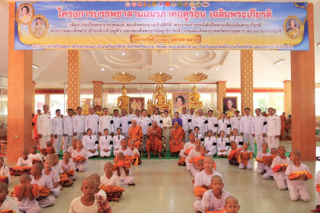 วันที่ 2 เมษายน 2569 นายศักดิ์ ภักเกลี้ยง ผู้อำนวยการสำนักงานเขตพื้นที่การศึกษาประถมศึกษาศรีสะเกษ เขต 4 ร่วมพิธีบรรพชาสามเณรภาคฤดูร้อน ตามโครงการบรรพชาสามเณรภาคฤดูร้อนเฉลิมพระเกียรติ เพื่อถวายเป็นพระราชกุศลแด่สมเด็จพระนางเจ้าสิริกิติ์ พระบรมราชินีนาถ พระบรมราชชนนีพันปีหลวง เพื่อเฉลิมพระเกียรติพระบาทสมเด็จพระวชิรเกล้าเจ้าอยู่หัว และสมเด็จพระกนิษฐาธิราชเจ้า กรมสมเด็จพระเทพรัตนราชสุดาฯ สยามบรมราชกุมารี ณ วัดบ้านเขวา ตำบลกระแชง อำเภอกันทรลักษ์ จังหวัดศรีสะเกษ โดยมี จ่าเอก สมควร สิงห์คำ นายอำเภอกันทรลักษ์ เป็นประธานในพิธี จัดโดย คณะสงฆ์ภาค 10 ร่วมกับคณะสงฆ์อำเภอกันทรลักษ์ และองค์กรภาคีเครือข่าย