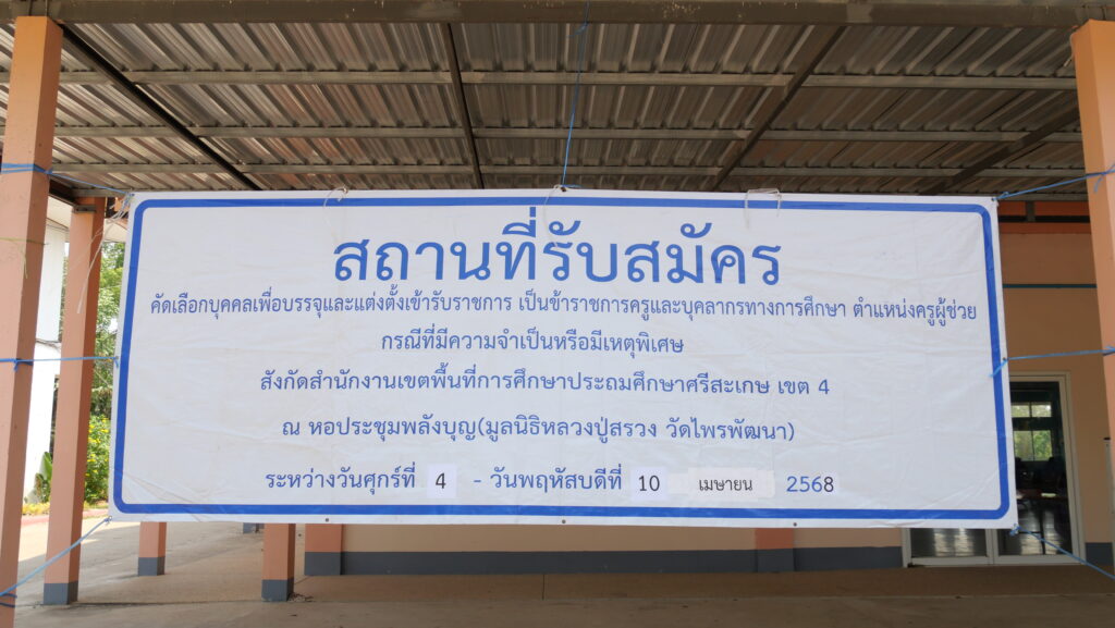นายลิขิต เพ็งประสิทธิพงศ์ ผู้อำนวยการสำนักงานเขตพื้นที่การศึกษาประถมศึกษาศรีสะเกษ เขต 4 กล่าวว่า เมื่อวันที่ 4 เมษายน 2568 สพป.ศรีสะเกษ เขต 4 ได้เปิดรับสมัครครูผู้ช่วย กรณีที่มีความจำเป็นหรือมีเหตุพิเศษเป็นวันแรก ตามที่ได้มีประกาศฯ รับสมัครคัดเลือกบุคคลเพื่อบรรจุและแต่งตั้งเข้ารับราชการเป็นข้าราชการครูบุคลากรทางการศึกษา ตำแหน่งครูผู้ช่วย กรณีที่มีความจำเป็นหรือมีเหตุพิเศษ สังกัดสำนักงานคณะกรรมการการศึกษาขึ้นพื้นฐาน ปี พ.ศ. 2568 ลงวันที่ 26 มีนาคม 2568 โดยกำหนดการรับสมัคร ตั้งแต่วันที่ 4 – 10 เมษายน 2568 เวลา 08:30 – 16:30 น. (ไม่เว้นวันหยุดราชการ) และในวันนี้ได้มอบหมายให้ นายปรีชา จันทวี รองผู้อำนวยการสำนักงานเขตพื้นที่การศึกษาประถมศึกษาศรีสะเกษ เขต 4 ตรวจเยี่ยมสถานที่รับสมัคร ณ หอประชุมพลังบุญ (มูลนิธิหลวงปู่สรวงวัดไพรพัฒนา) สพป.ศรีสะเกษ เขต 4 บรรยากาศการรับสมัครวันแรกเป็นไปด้วยความเรียบร้อย